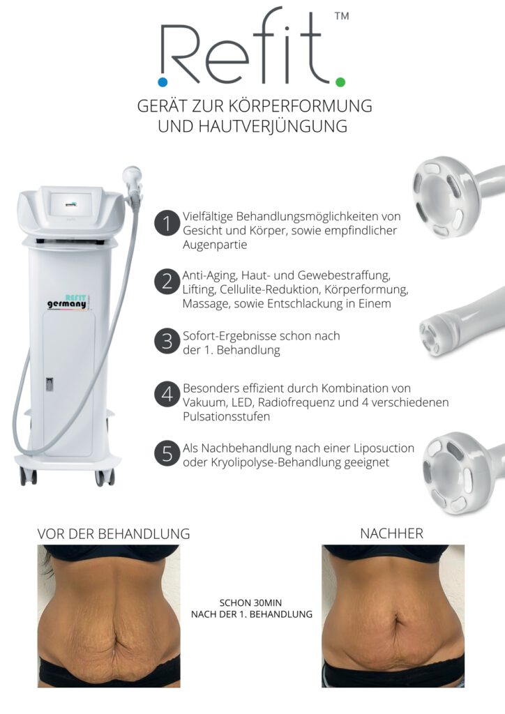 Refit arbeitet mit Radiofrequenz, Vakuumtechnologie und mechanischer Stimulation. Diese Methoden fördern die Fettmobilisation, verbessern die Durchblutung und regen die Kollagenproduktion an. Das Ergebnis ist sichtbare ästhetische Verbesserung bei gleichzeitig angenehmer, nicht-invasiver Behandlung.